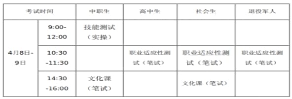 考核采取“文化素质”考试+“职业技能”测试(职业适应性测试或职业技能测试)组成。